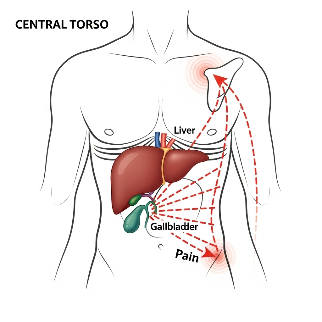 간혹 오른쪽 날개뼈 밑의 통증이 쉽게 풀리지 않는다면, 내장 질환에 의한 연관통일 가능성이 있어요. 간, 담낭(특히 담석증), 췌장 질환 등도 등쪽 불편감을 동반할 수 있습니다.